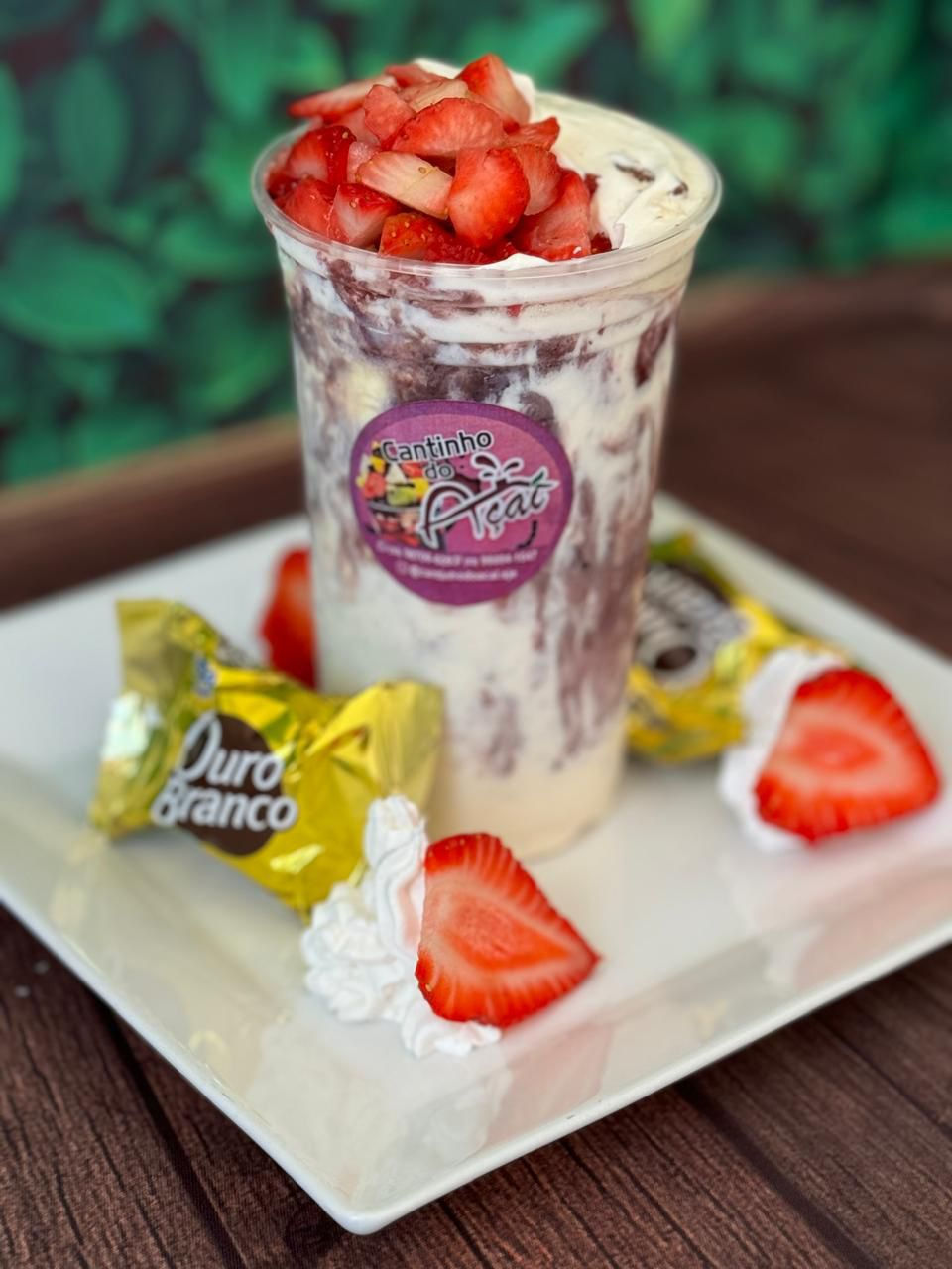 Leite condensado, leite ninho, Laka, Oreo, creme de ninho, chantilly, morango e canudo